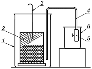 1 - мерный сосуд; 2 - корзина; 3 - проволока; 4 - сифонная трубка; 5 - резиновый шланг с зажимом; 6 - вспомогательный сосуд