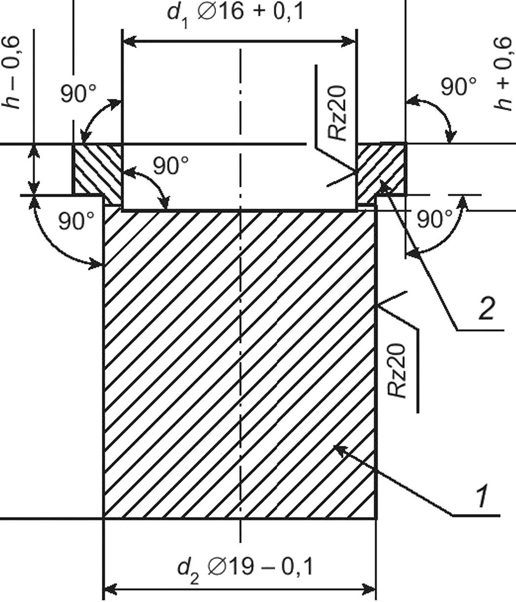 В.2.3 При изготовлении образцов следует обеспечить соосность поверхностей диаметром 16 мм и 19 мм. Вначале из прямоугольных заготовок изготавливают цилиндрические образцы диаметром 23 мм, затем для выявления границы между основным и коррозионно-стойким слоем образцы подвергают нагреву при температуре в диапазоне от 150 °C до 200 °C в течение 2—3 мин или смазывают одну сторону слабым раствором любой кислоты. На образцах выявляется граница между основным и коррозионно-стойким слоем, что дает возможность правильно выточить образец, обеспечивая удаление коррозионно-стойкого и части основного слоев на глубину, превышающую высоту волны их соединения (в случае испытания образцов от листа, полученного сваркой взрывом).