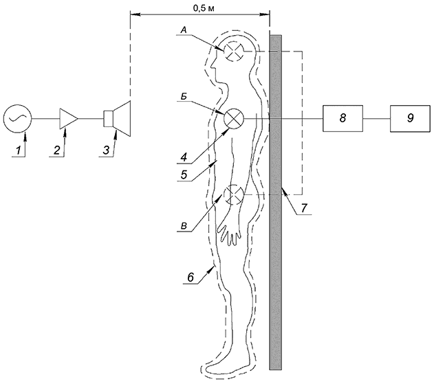 1 - генератор; 2 - усилитель; 3 - излучающая антенна; 4 - изотропный зонд, положение изотропного зонда: А - область головы, Б - область груди, В - область паха; 5 - испытательный манекен; 6 - испытуемый образец; 7 - держатель для испытуемого образца; 8 - измерительный блок; 9 - персональный компьютер