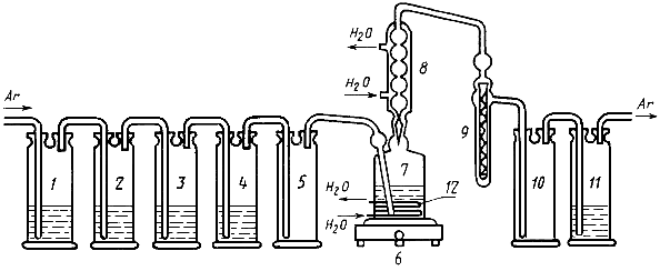 полярографического фона, вставляют в приемник конус газоотводной трубки, соединяют тубус приемника с предохранительной склянкой 10 и пропускают через установку аргон со скоростью 30-35 пузырьков в 10 с. Подключают холодильник к водопроводу и, спустя 5-10 мин, включают электроплитку 6. С момента закипания отгонку продолжают 30 мин.