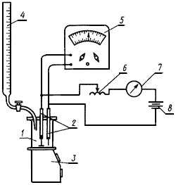 Раствор, объем которого не должен превышать 50 см, переливают в сосуд с ртутным катодом, используя в качестве анода платиновую спираль, и подвергают электролизу при силе тока 4 А и напряжении 5-6 В. Электролиз продолжают до тех пор, пока из раствора не будет полностью удалено железо (капельная реакция с железосинеродистым калием на фарфоровой пластинке или фильтре).
