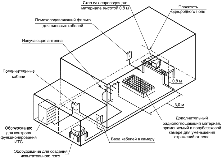 3.2.3 модифицированная полубезэховая камера (modified semi-anechoic chamber): Полубезэховая камера с дополнительным поглощающим электромагнитные волны материалом, установленным на пластине заземления.