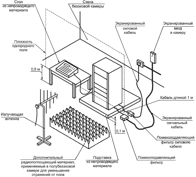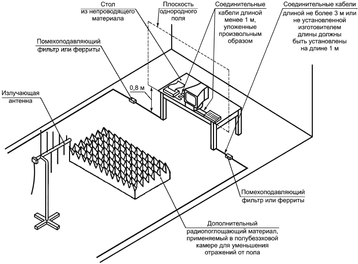 Расположение излучающих антенн и кабелей должно быть зафиксировано как можно точнее. При проведении испытаний антенны и кабели должны быть размещены так же, как и при калибровке поля. Незначительные их смещения оказывают существенное влияние на испытательное поле.
