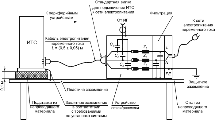 Рисунок 12 - Пример установки для испытаний ТС, подключаемых к сети электропитания гибким кабелем с вилкой, на месте эксплуатации, с подачей НИП на порты электропитания переменного тока и порт защитного заземления