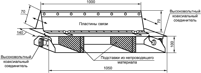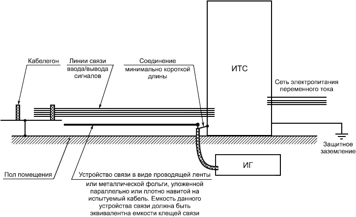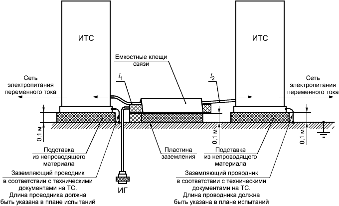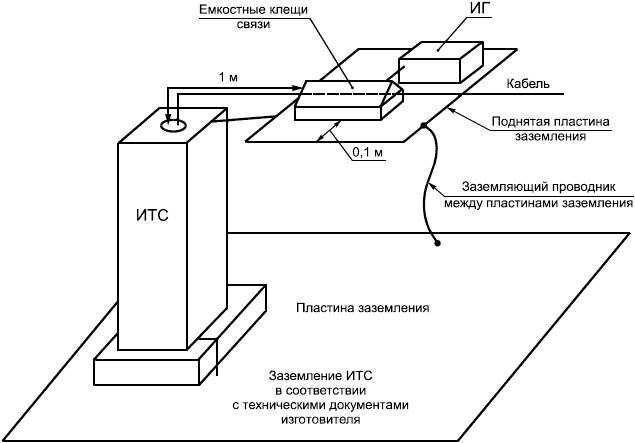 Примечание - Допускается установка емкостных клещей связи на стене экранированного помещения или на другой заземленной поверхности. Емкостные клещи связи соединяют с корпусом ИТС. При испытаниях напольных ИТС значительных размеров с кабелями, выводимыми наверху, допускается установка клещей связи на высоте 10 см над центром ИТС. При этом кабели, подключаемые к емкостным клещам связи, пропускают через центр пластины заземления клещей.