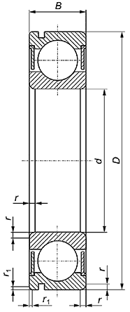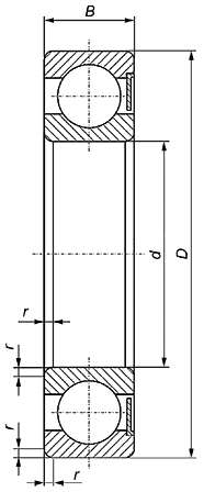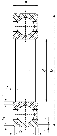 5.4.1 Номинальный диаметр отверстия, номинальный наружный диаметр, номинальная ширина подшипника, наименьший единичный размер монтажной фаски и наименьший единичный размер монтажной фаски наружного кольца со стороны канавки под установочное пружинное кольцо должны соответствовать значениям, указанным в таблицах 2-6.